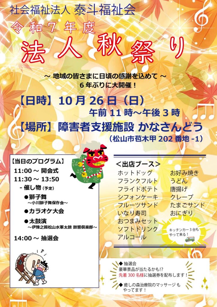 10月26日(日)午前11時から、障害者支援施設かなさんどうにて、『法人秋祭り』を開催します。